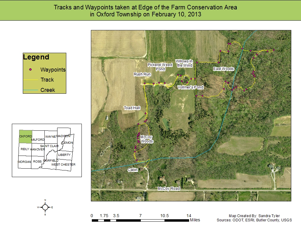 On this lovely winter day, I took GPS points with a Garmin 62 while walking throughout EFCA and taking lots of notes. These points, known as "waypoints", were then downloaded with the "track" and put into ArcGIS and made into a map. The "track" is the path that I walked while using the GPS.